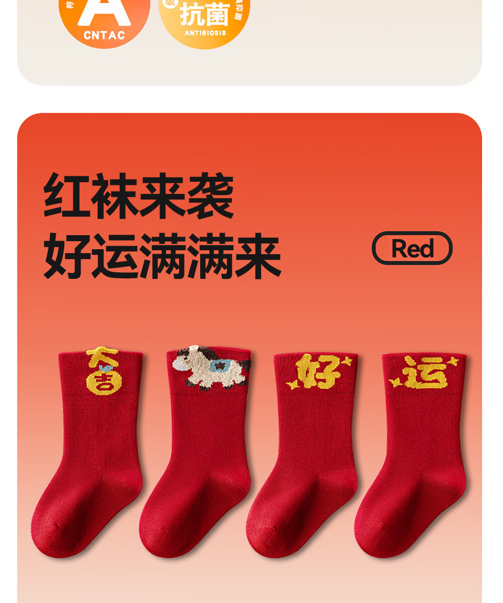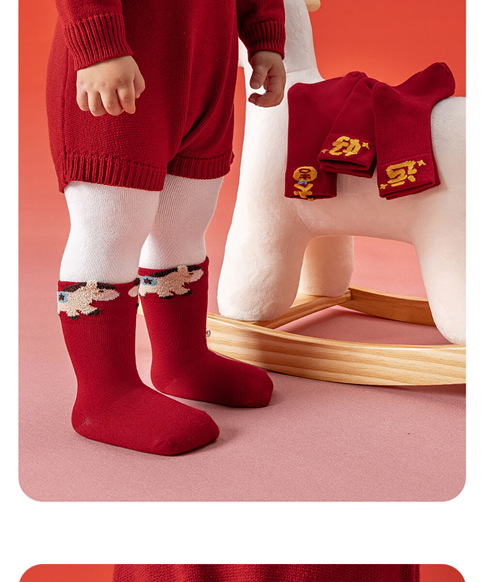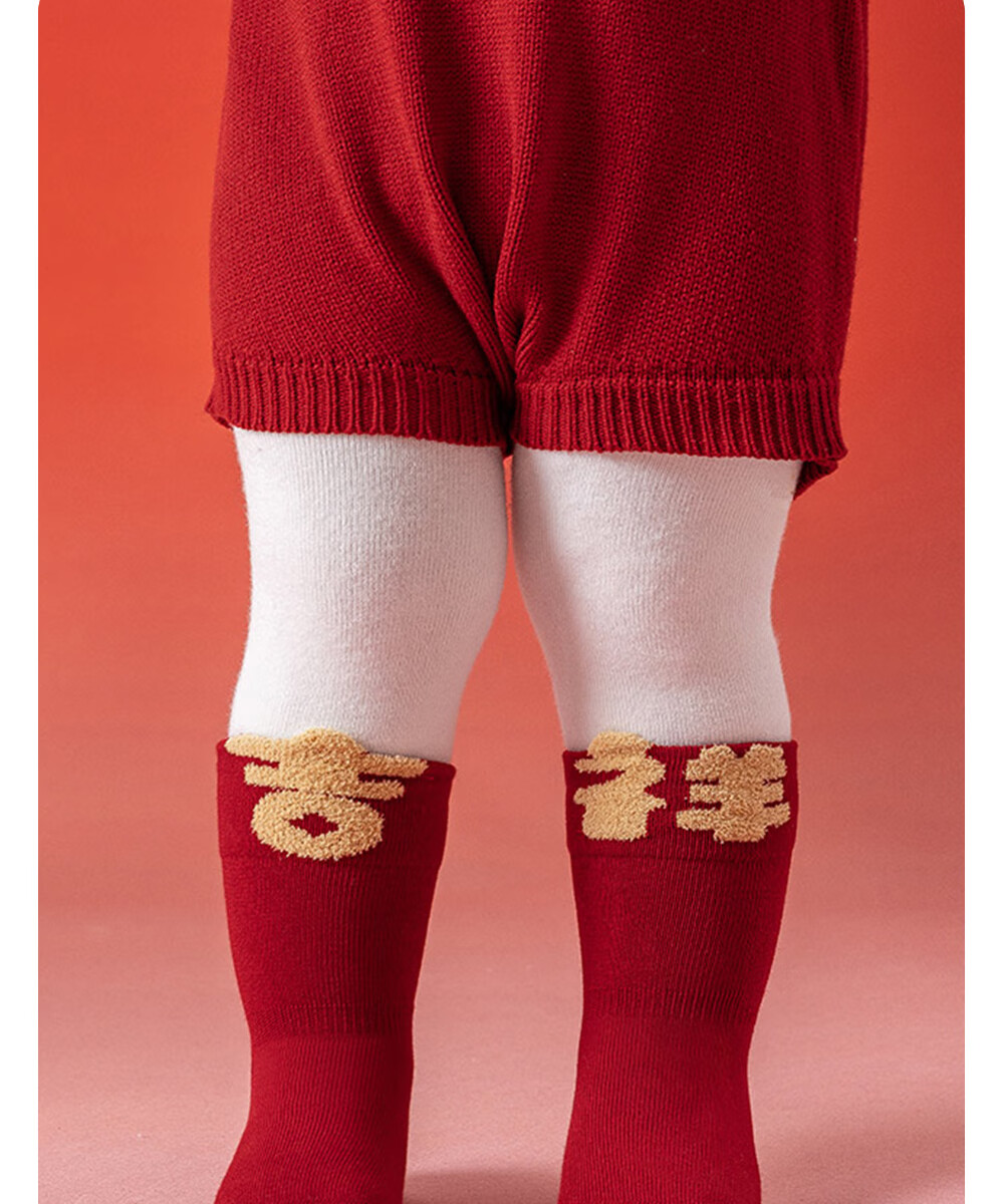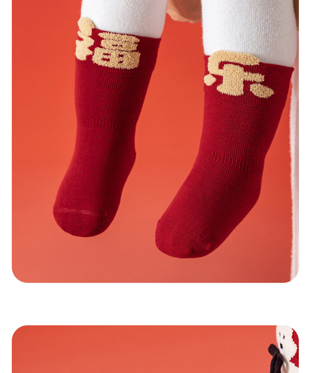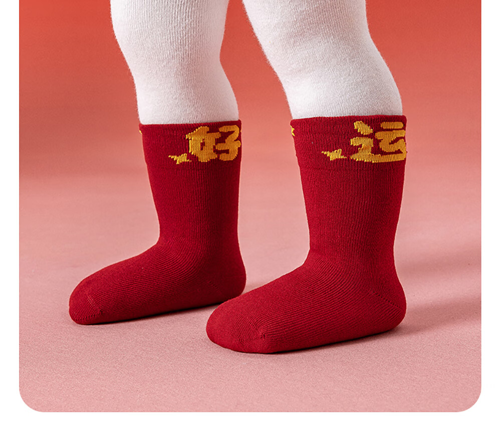 贝肽斯婴儿袜冬季新年新生儿宝宝中筒袜周岁满月百天加厚红色袜子 吉祥福乐-4双装 1-3岁 建议脚长12-14cm