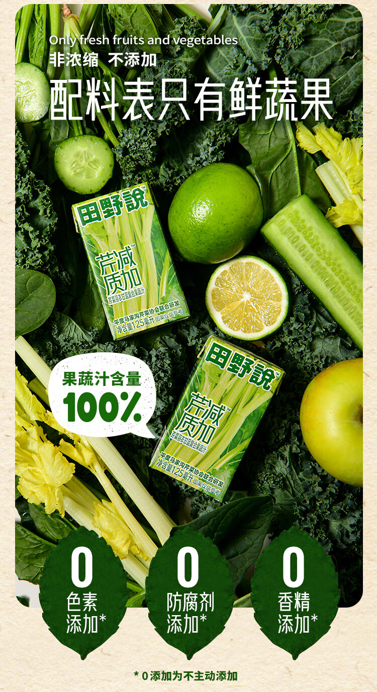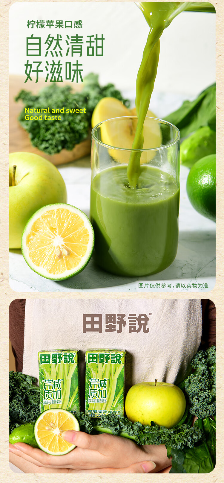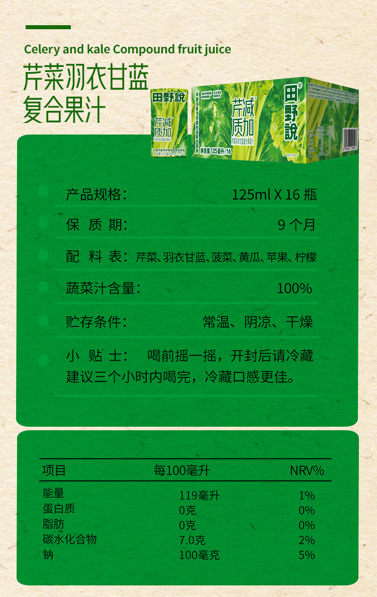 田野说芹菜汁羽衣甘蓝汁果蔬汁饮料100%果汁饮料整箱装年货春节送礼年货 125mL*32盒