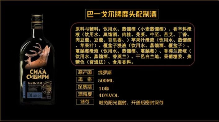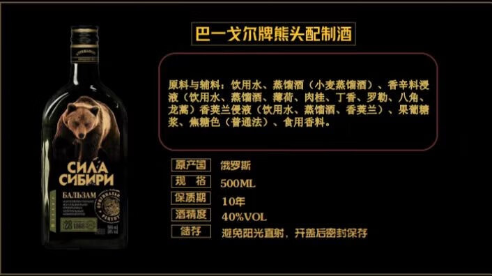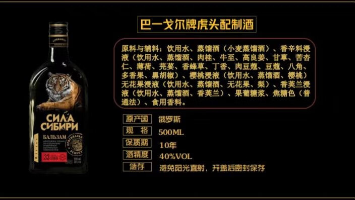 巴一戈尔俄罗斯原装进口巴一戈尔町酒虎鹿熊酒 40度 500mL 1瓶 虎酒