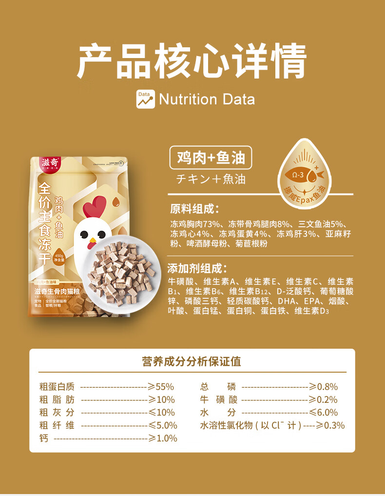滋奇(Ziiky)鸡肉鱼油主食冻干生骨肉Epax超纯鱼油添加全价全期成幼猫干粮450g 鸡肉鱼油味3袋/1350g