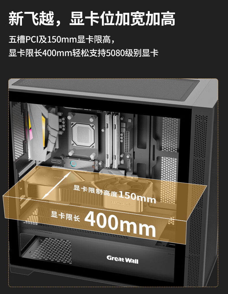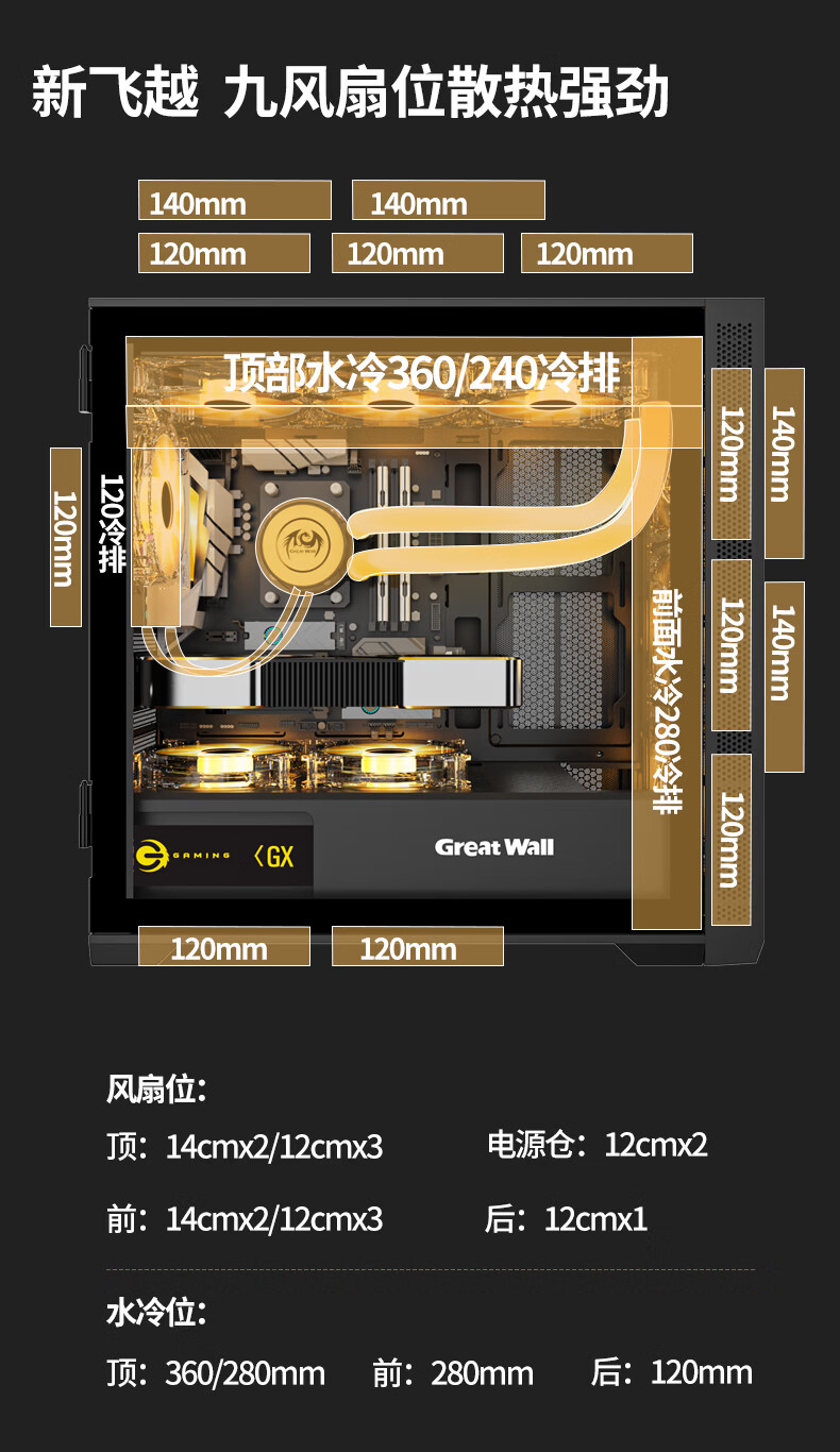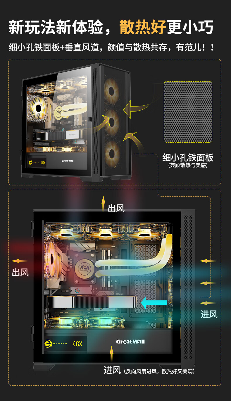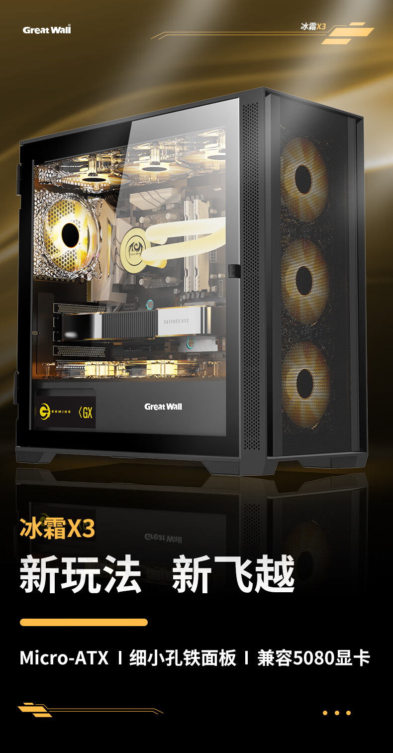 长城(Great Wall)冰霜X3黑色电脑机箱(MATX/360水冷位/磁吸翻门/细网孔金属面板/U3/9风扇位/五槽PCI/兼容5080)